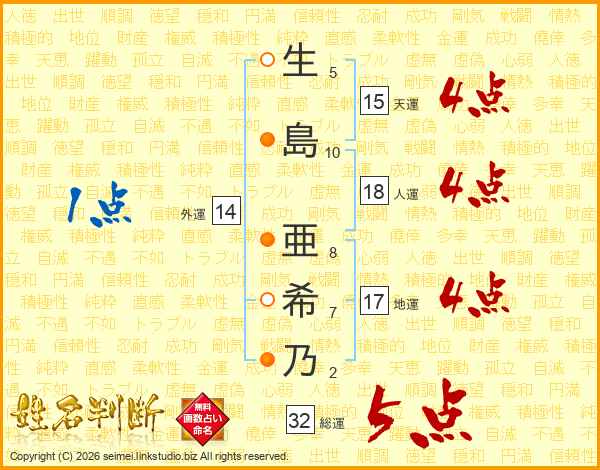 生(5画)島(10画) 亜(8画)希(7画)乃(2画)