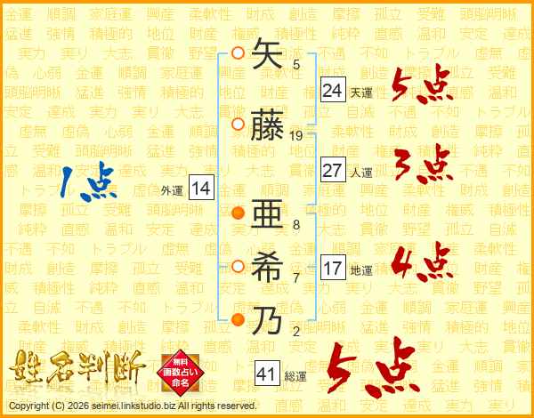 矢(5画)藤(19画) 亜(8画)希(7画)乃(2画)