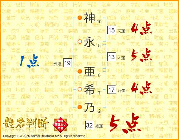 神(10画)永(5画) 亜(8画)希(7画)乃(2画)