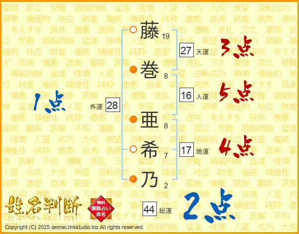 藤(19画)巻(8画) 亜(8画)希(7画)乃(2画)
