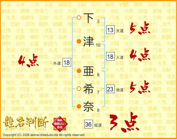 下(3画)津(10画) 亜(8画)希(7画)奈(8画)
