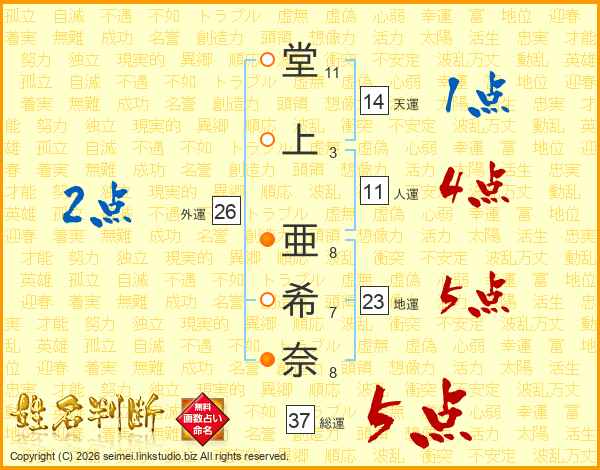 堂(11画)上(3画) 亜(8画)希(7画)奈(8画)