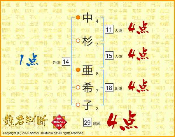中(4画)杉(7画) 亜(8画)希(7画)子(3画)