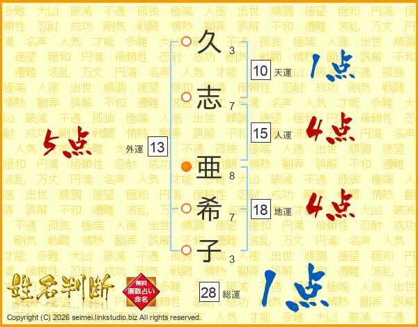 久(3画)志(7画) 亜(8画)希(7画)子(3画)