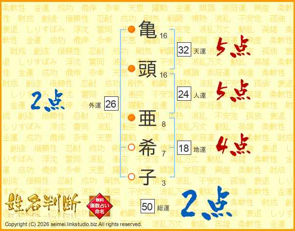 亀(16画)頭(16画) 亜(8画)希(7画)子(3画)