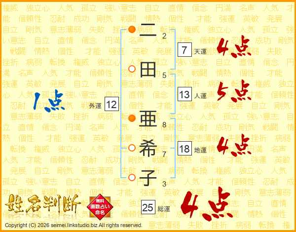 二(2画)田(5画) 亜(8画)希(7画)子(3画)