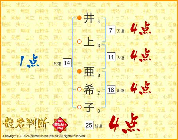 井(4画)上(3画) 亜(8画)希(7画)子(3画)