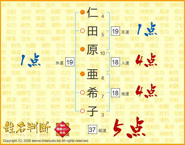 仁(4画)田(5画)原(10画) 亜(8画)希(7画)子(3画)