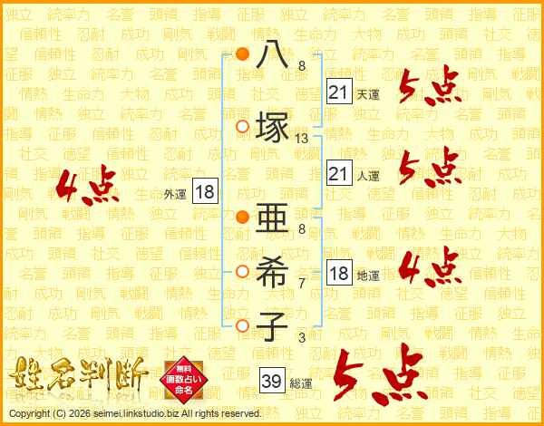 八塚亜希子さんの総運は39画の5点!