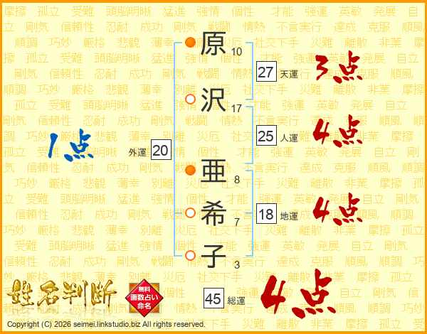 原(10画)沢(17画) 亜(8画)希(7画)子(3画)