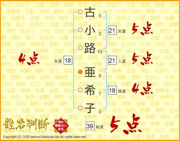 古(5画)小(3画)路(13画) 亜(8画)希(7画)子(3画)