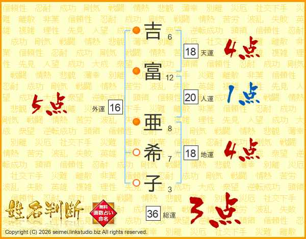 吉(6画)富(12画) 亜(8画)希(7画)子(3画)