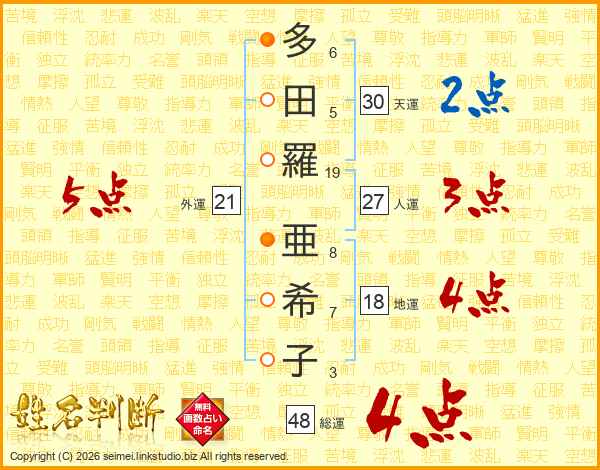 多(6画)田(5画)羅(19画) 亜(8画)希(7画)子(3画)