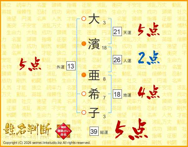 大(3画)濱(18画) 亜(8画)希(7画)子(3画)