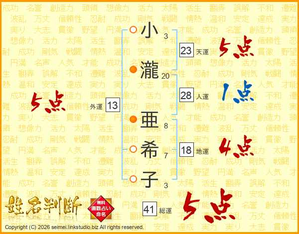 小(3画)瀧(20画) 亜(8画)希(7画)子(3画)