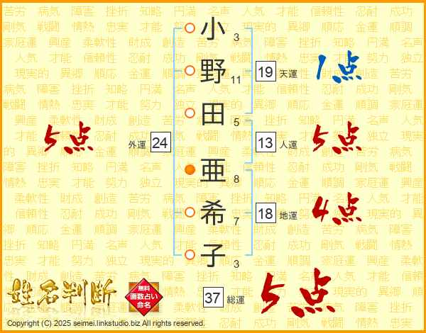 小(3画)野(11画)田(5画) 亜(8画)希(7画)子(3画)