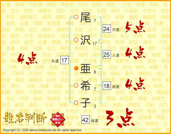 尾(7画)沢(17画) 亜(8画)希(7画)子(3画)