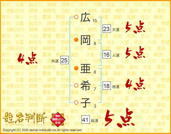 広(15画)岡(8画) 亜(8画)希(7画)子(3画)
