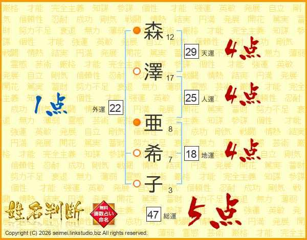 森(12画)澤(17画) 亜(8画)希(7画)子(3画)
