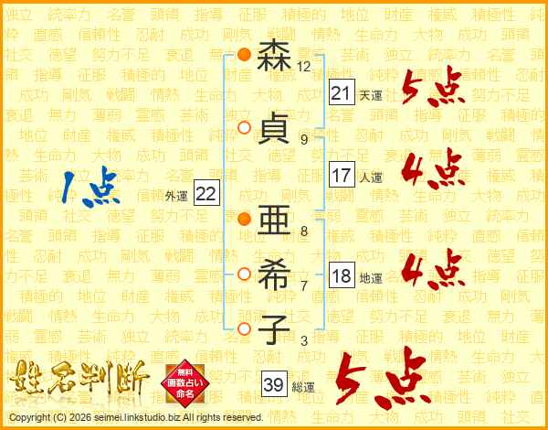 森(12画)貞(9画) 亜(8画)希(7画)子(3画)
