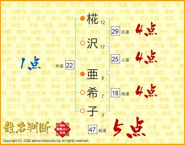 椛(12画)沢(17画) 亜(8画)希(7画)子(3画)