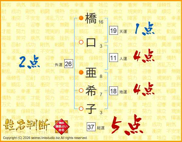 橋(16画)口(3画) 亜(8画)希(7画)子(3画)