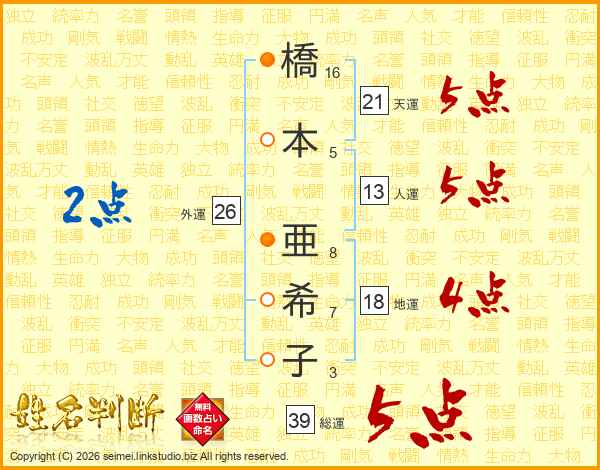 橋(16画)本(5画) 亜(8画)希(7画)子(3画)