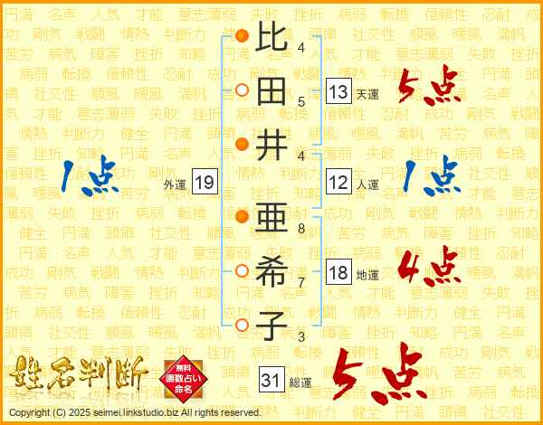 比(4画)田(5画)井(4画) 亜(8画)希(7画)子(3画)