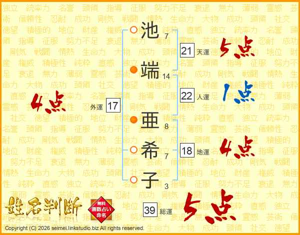 池(7画)端(14画) 亜(8画)希(7画)子(3画)