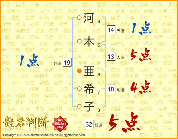 河(9画)本(5画) 亜(8画)希(7画)子(3画)