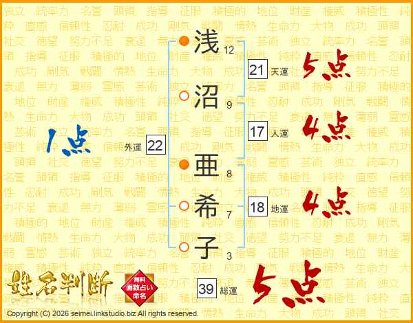 浅沼亜希子さんの総運は39画の5点!