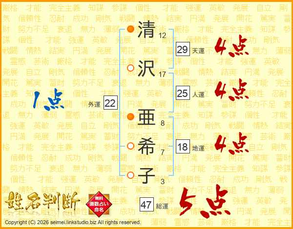 清沢亜希子さんの総運は47画の5点!