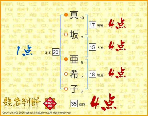 真坂亜希子さんの総運は35画の4点!