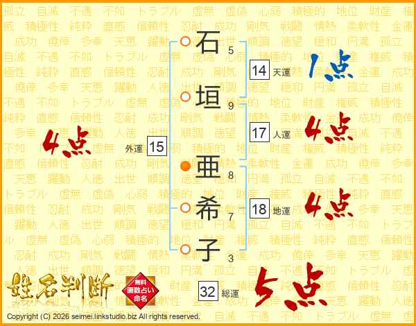 石(5画)垣(9画) 亜(8画)希(7画)子(3画)