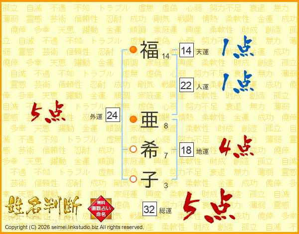福(14画) 亜(8画)希(7画)子(3画)