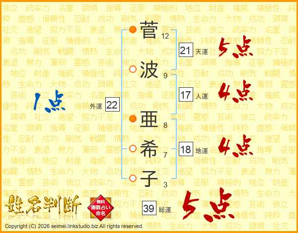 菅(12画)波(9画) 亜(8画)希(7画)子(3画)