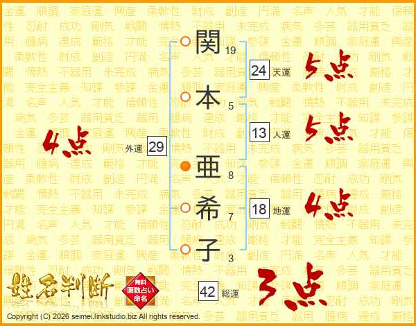 関(19画)本(5画) 亜(8画)希(7画)子(3画)