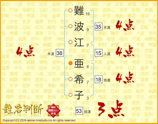難(19画)波(9画)江(7画) 亜(8画)希(7画)子(3画)