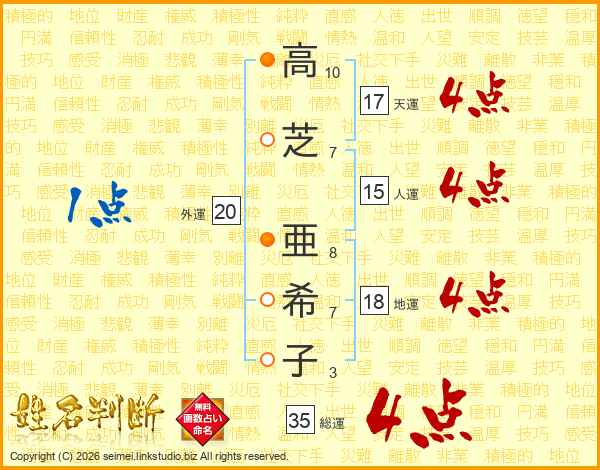 高(10画)芝(7画) 亜(8画)希(7画)子(3画)