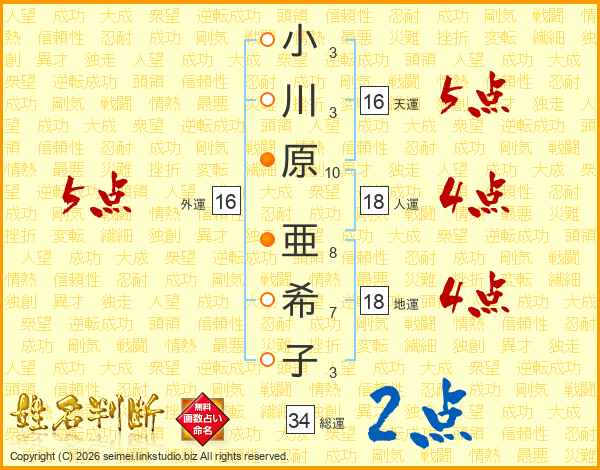 小(3画)川(3画)原(10画) 亜(8画)希(7画)子(3画)