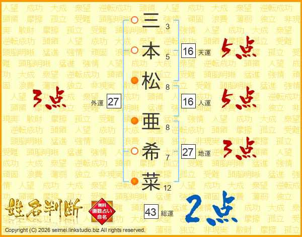 三(3画)本(5画)松(8画) 亜(8画)希(7画)菜(12画)
