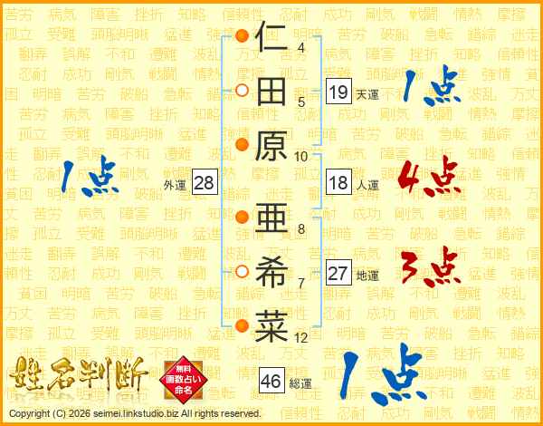 仁(4画)田(5画)原(10画) 亜(8画)希(7画)菜(12画)