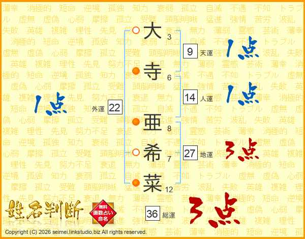 大(3画)寺(6画) 亜(8画)希(7画)菜(12画)