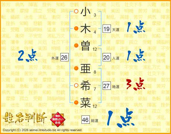 小(3画)木(4画)曽(12画) 亜(8画)希(7画)菜(12画)