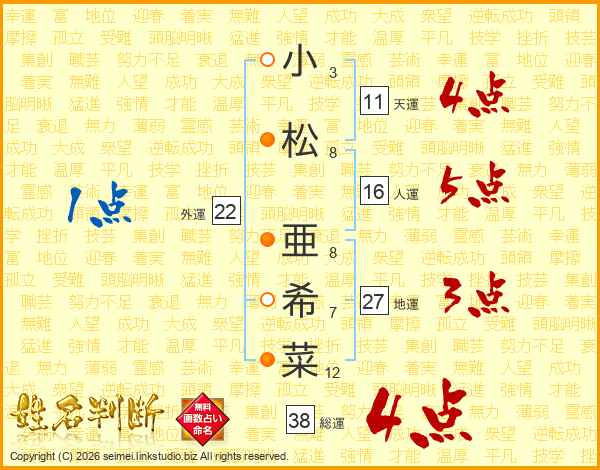 小(3画)松(8画) 亜(8画)希(7画)菜(12画)