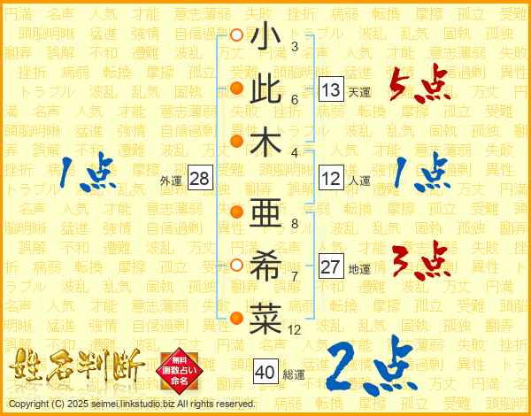 小(3画)此(6画)木(4画) 亜(8画)希(7画)菜(12画)