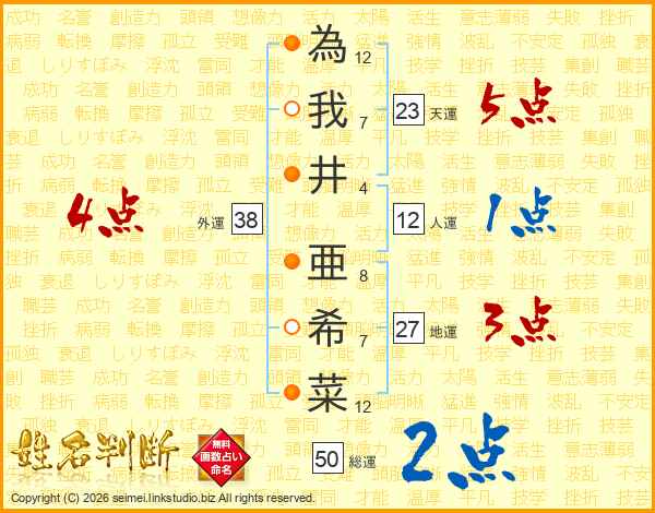 為我井亜希菜さんの外運は38画の4点!