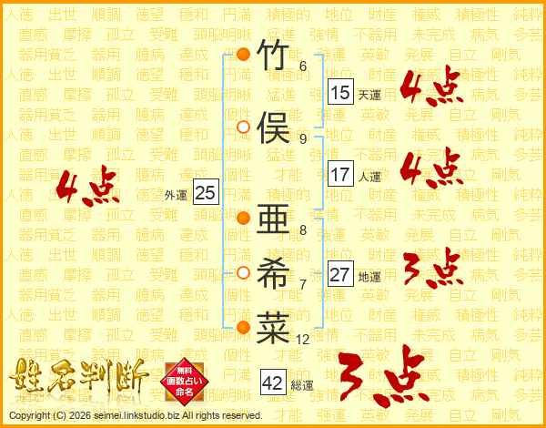 竹俣亜希菜さんの天運は15画の4点!