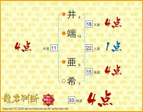 井(4画)端(14画) 亜(8画)希(7画)