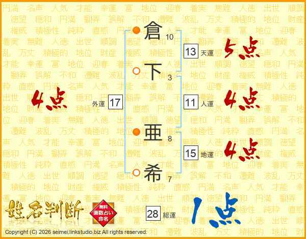 倉(10画)下(3画) 亜(8画)希(7画)